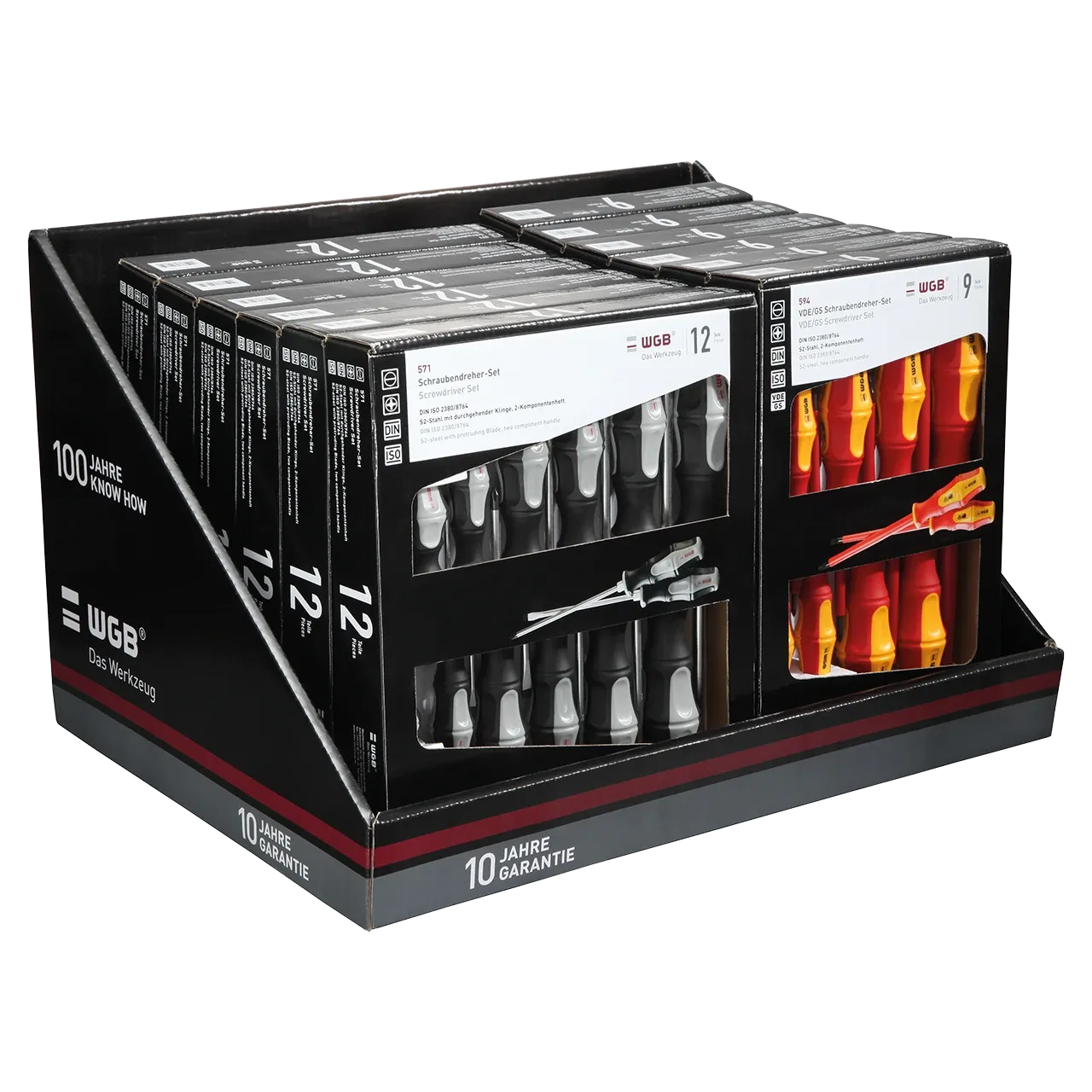 Skruvmejselsatser, DIN ISO 2380, DIN ISO 8764, S2-proffsstål Förkromat | Isolerade enligt DIN EN 60900 (VDE 0682/201) 2-komponentsbroschyr 6 x Skruvmejselsats, DIN ISO 2380, DIN ISO 8764 12-delar I genomskinlig kartong Verktygsskruvmejslar: 6,0 x 38 | 3,0 x 75 | 5,0 x 150 | 6,0 x 150 | 8,0 x 150 mm PH-skruvmejslar: PH2 x 38 | PH0 x 75 | PH1 x 150 | PH2 x 150 | PH3 x 150 mm 6 x VDE-skruvmejselsats, DIN ISO 2380, DIN ISO 8764 9-delar I genomskinlig kartong VDE-verktygsskruvmejslar: 2,5 x 75 | 4,0 x 100 | 5,5 x 125 | 6,5 x 150 mm VDE-PH-skruvmejslar: PH0 x 60 | PH1 x 80 | PH2 x 100 | PH3 x 150 mm Spänningsprovare: 3,0 x 65 mm